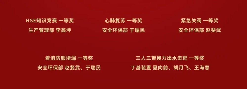 應急技能比武第一名名單 經過激烈的角逐,生產管理部李鑫坤、安全環保部于瑞民等人獲得各項比賽一等獎。 此次應急技能比武,檢驗了員工的消防器材使用技能、應急處置能力和協調作戰能力,為各部門員工創造了一個切磋技能、交流學習、共同提高的平臺。通過此次技能比武,對加強公司應急管理工作,提升員工應急救援處置能力,保障安全生產起到積極促進作用。 |