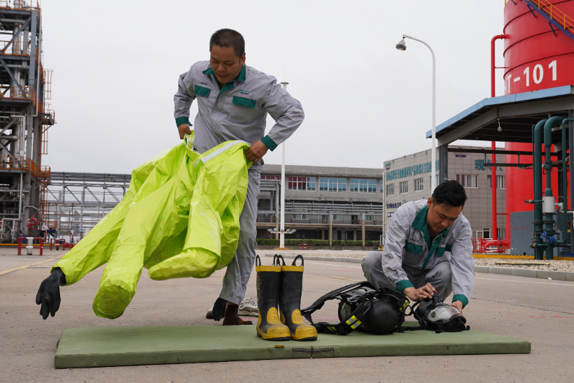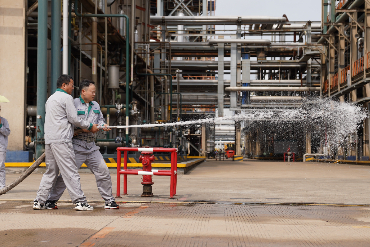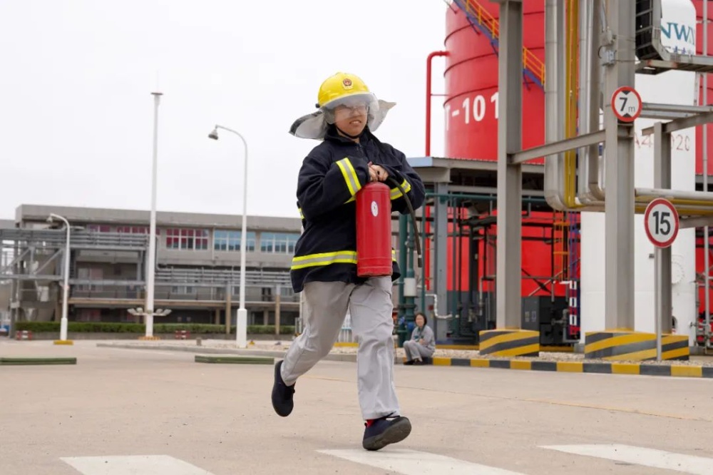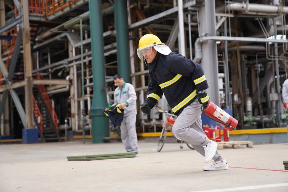 本次比武設HSE知識競賽、佩戴空呼器著防化服、油桶滅火、三人三帶接力出水擊靶等四個項目。 盡管盛夏六月驕陽似火,但并沒有阻擋參賽選手們的熱情。在佩戴空呼器著防化服項目中,選手兩兩一組配合默契,從檢查到操作每個步驟都有條不紊絲毫不差。在三人三帶接力比武現場,參賽選手們斗志昂揚、奮勇拼搏,快速完成了分水器連接、水帶展開、加壓和擊靶等動作。